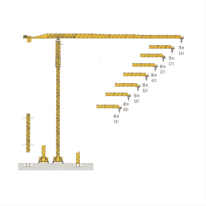 2. When several tower cranes need to operate close to each other on the same construction site, using a flat-head tower crane can save a lot of costs. Since the flat-head tower crane eliminates the tower head, the independent height is reduced, and the height of the tower cranes installed in the construction site can be reduced accordingly, which can save installation time and reduce the central pressure of each tower crane, which is suitable for It is suitable for cross-operation of multiple tower cranes and construction in occasions with special height requirements.